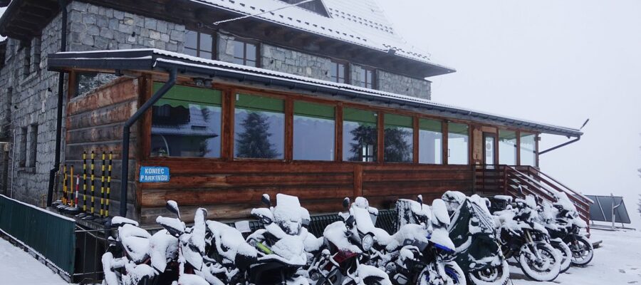 Sobota przywitała nas śniegiem. Motocykle pokryte białym puchem może wyglądały ładnie, lecz nie nastrajały zbyt pozytywnie do przejażdżki, którą mieliśmy zaplanowaną w samo południe. Ale to góry, więc warunki pogodowe lubią się szybko zmieniać. Przez poranne mgły i chmury przedarło się słonko i zaczęło ogrzewać zaśnieżoną Głodówkę. Po pysznym śniadaniu, kilku kawach oraz wielu rozmowach o motocyklowych wycieczkach i planach, zaczęliśmy się zbierać do wyjazdu.